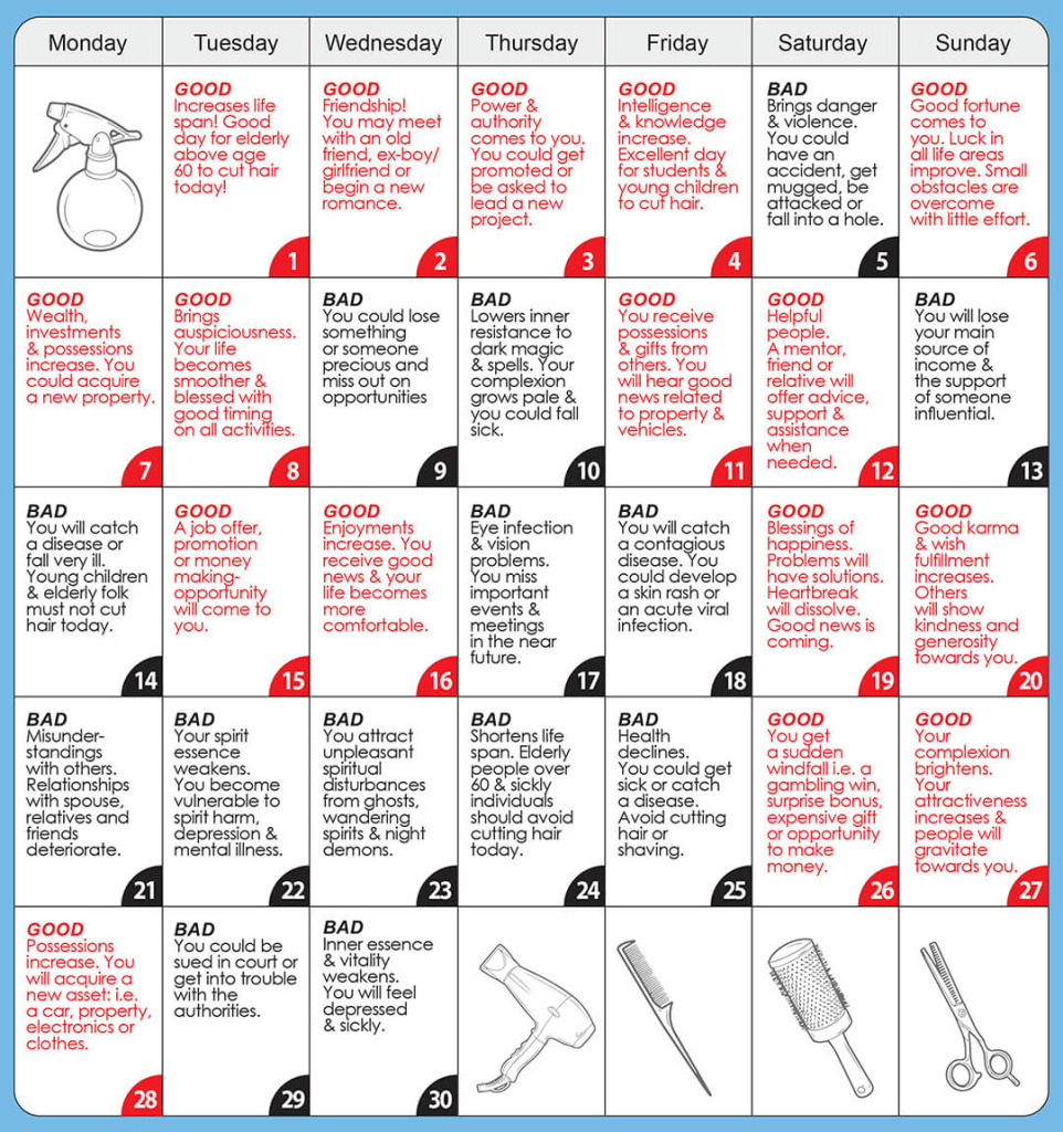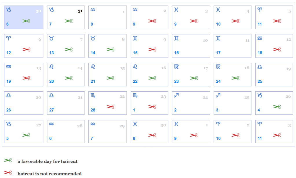 Lịch âm của việc cắt tóc được thực hiện có tính đến ảnh hưởng của các ngày âm lịch, các giai đoạn của mặt trăng, vị trí của mặt trăng trong các cung hoàng đạo, nguyệt thực của mặt trời và mặt trăng, ảnh hưởng của ngày tuần, cũng như các hành tinh và nhà khác của tử vi. Đánh giá chung về sự kiện và ngày được chia thành các ngày thuận lợi, không thuận lợi và trung tính để cắt tóc