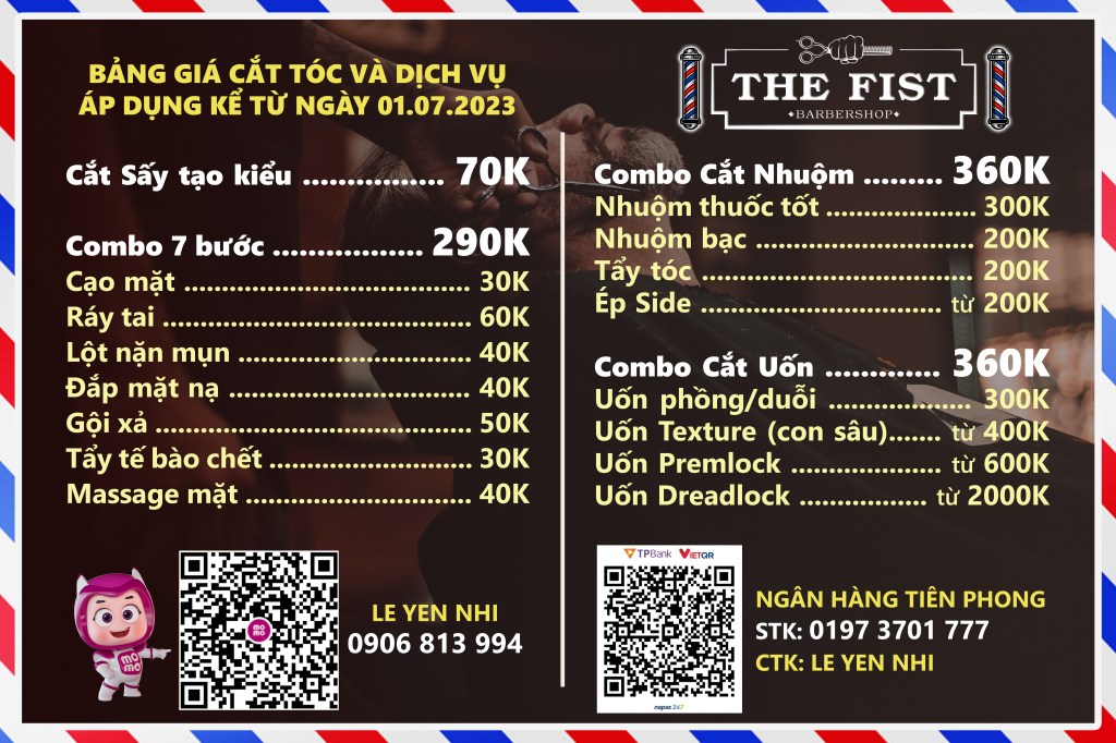 Do nhu cầu vật chất tăng cao, cùng tình hình lạm phát khiến giá nguyên vật liệu leo thang, The Fist Barbershop xin thông báo tăng giá dịch vụ theo bảng giá cắt tóc và dịch vụ bên dưới: